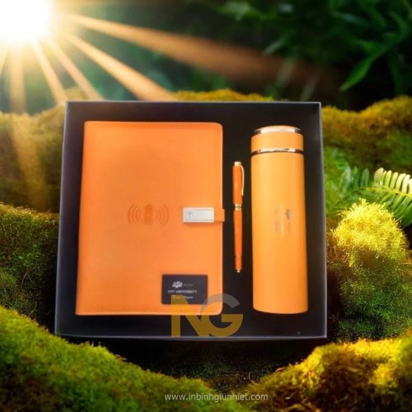 Bình giữ nhiệt quà tặng in logo doanh nghiệp sổ tay bút bi màu cam