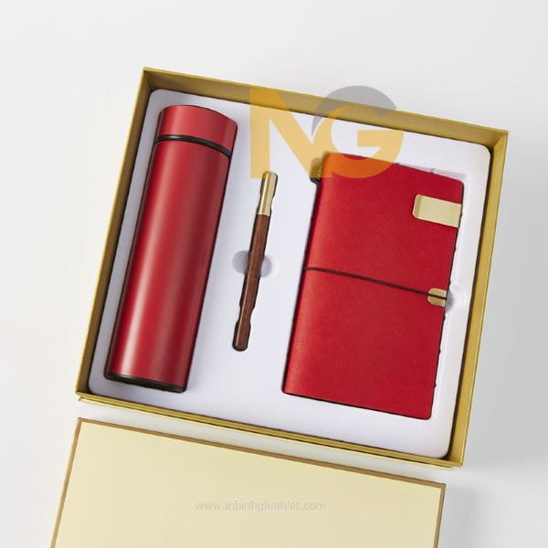 Bình giữ nhiệt quà tặng in logo doanh nghiệp sổ tay bút bi màu đỏ