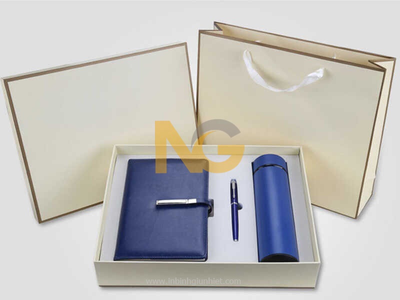 Bình giữ nhiệt quà tặng in logo kèm sổ tay da màu xanh dương bút bi in logo công ty